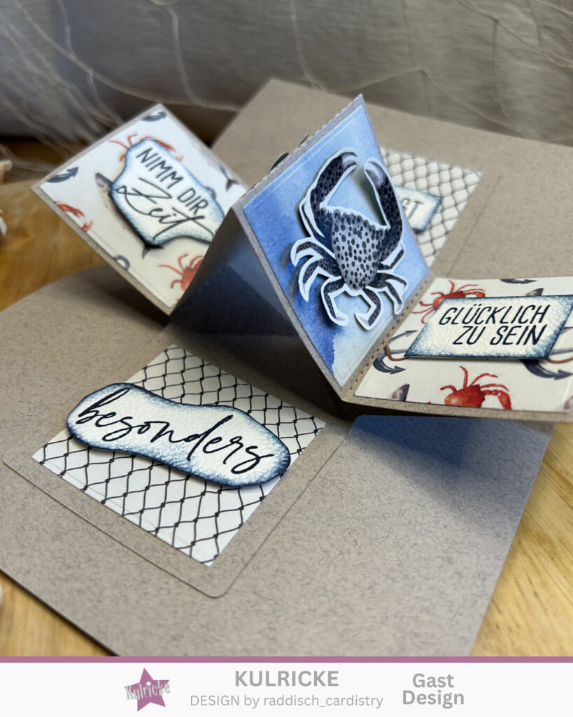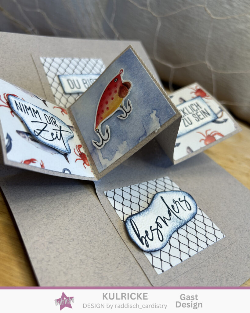 In dem Stanzenset der Zauber-Panel Karte sind auch zwei Stanzen für die quadratischen Aufleger dabei. Einfach das gewünschte Designpapier aussuchen und schon gehts los. Im Designpapier Set „Anglerglück“ ist auch das Papier mit den Fischen enthalten, die einfach ausgeschnitten werden können.