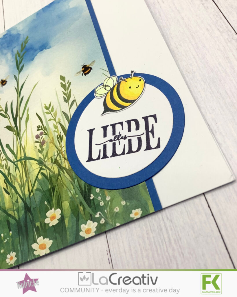 Jetzt habe ich noch die Biene aus dem Set SST694 Honigbienen koloriert, leider ist das Set nicht mehr im Shop, und habe sie auf die Kreise geklebt, die ich mit Abstandsband auf die Karte brachte.
