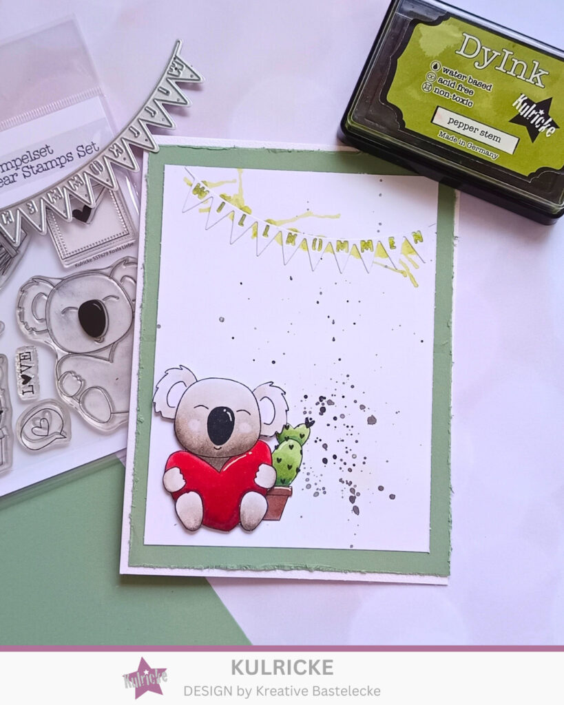 Ich habe das Stempelkissen in der Farbe pepper stem benutzt. Dies mit Wasser verdünnt im Hintergrund aufgetragen und wie damals mit einem Strohhalm weggepustet. So in der Effekt wie auf der Karte entstanden. Wie findet ihr sie? Wofür würdet ihr sie verwenden? In dem Sinne – traut euch kreativ zu sein.