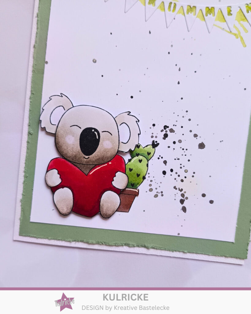 Hier habe ich das Set Koala Liebe verwendet. Den kleinen Kerlchen mit meinen Copic´s koloriert und mit dem süßen kleinen Kaktus im Hintergrund, in Szene gesetzt.