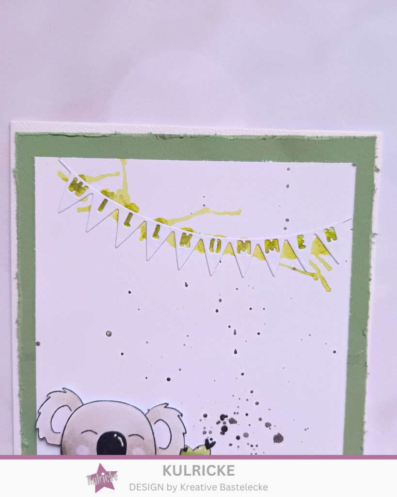 Danach kam die neue Stanze Wimpelkette Willkommen in Einsatz. Diese habe ich im gleichen weißen Cardstock ausgestanzt, wie im Hintergrund verwendet. Damit aber sich farblich das ganze abhebt, habe ich es mit einer Stempelfarbe unterlegt.