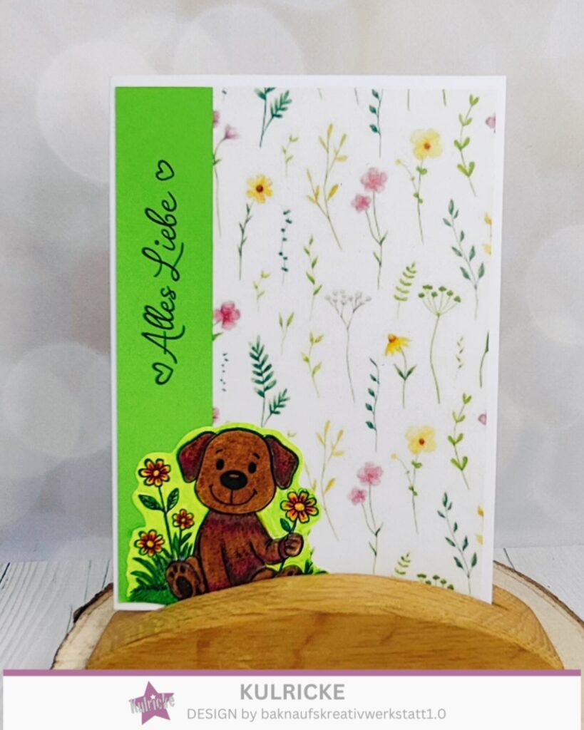 Ihr braucht eine Grundkarte im von Grundmaß 21×14,5cm gefalzt auf der langen Seite bei 10,5cm. Das DSP halbieren (7,5 cm) und auf 14 cm kürzen. Ein Rest Cardstock Stück schneiden im Maß von 14 mal 2,5 cm. DSP und Cardstock Streifen nebeneinander auf die Grundkarte kleben. Jetzt den Hund abstempeln und colorieren. Dann den Seitenstreifen Cardstock mit dem Spruch bestempeln. Fertig ist eure Karte.