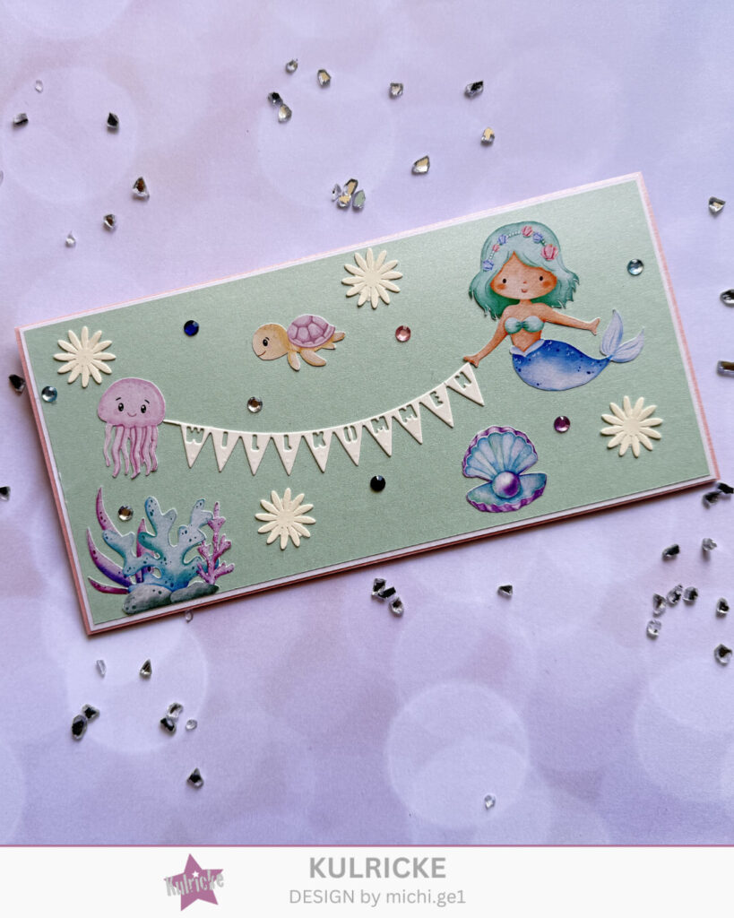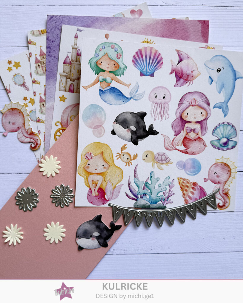 Aus dem Designpapier „Prinzessinnen und Meerjungfrauen“ die gewünschten Motive ausschneiden und aufkleben.