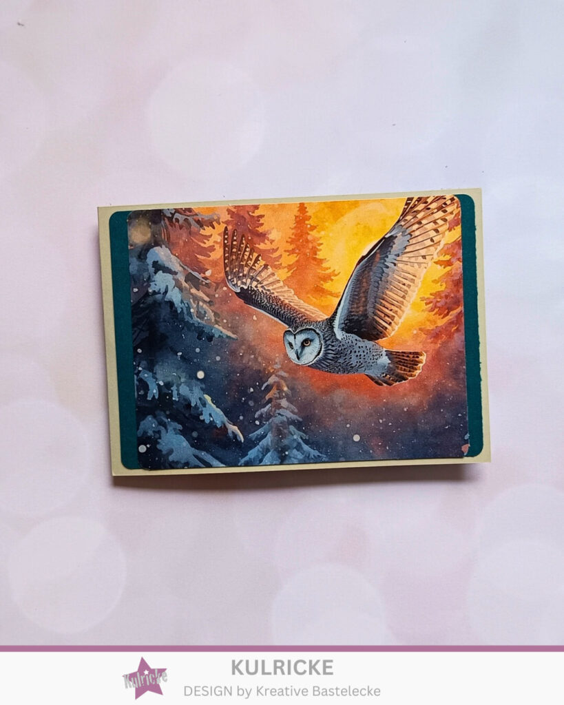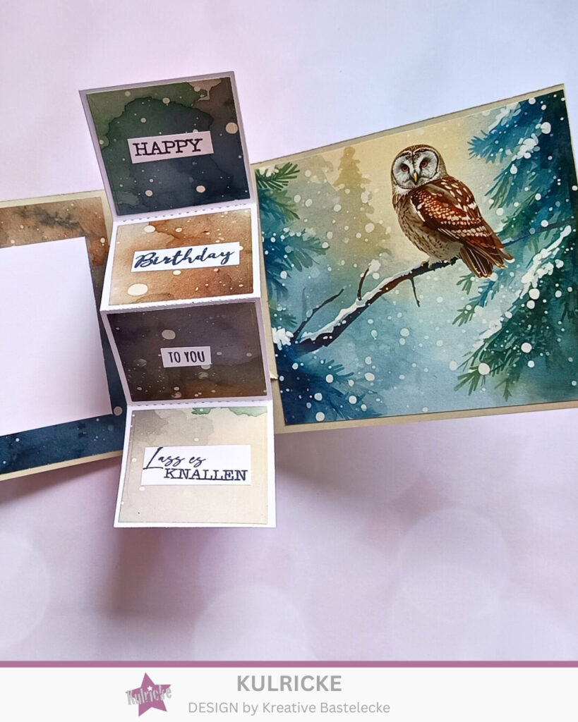 Alles – wie in Anleitung – zusammen gebaut ging es schon an die Gestaltung der Karte. Hierfür habe ich das Designpapier Zauberhafte Wintereulen hergenommen. Wie man weiß, ich liebe Eulen und das Designpapier schreit förmlich nach meinem Namen. Auf der linken Seite habe ich noch ein Stück weißen Cardstock geklebt, um einfach noch Platz für einen Geburtstagsgruß zu haben. In der Mitte, mit dem Pop Up Element, habe ich das „Happy Birthday to you – Lass es knallen“ in Szene gesetzt. Dafür habe ich das Stempelsets Fantastischer Geburtstag benutzt.