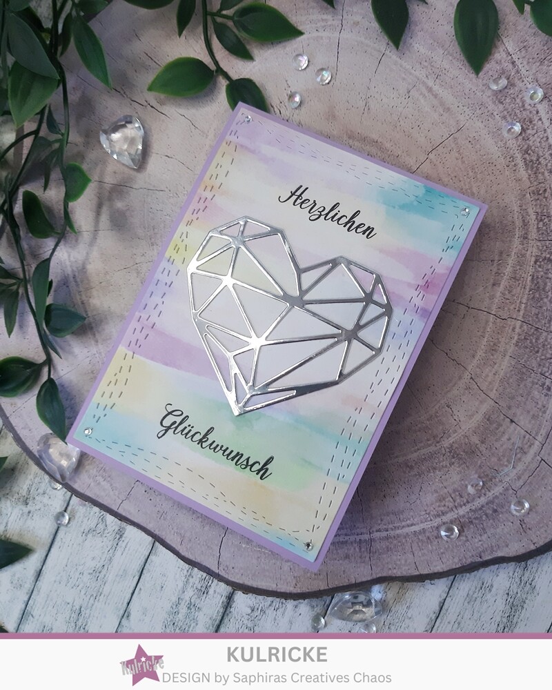 Zum Schluss habe ich auf die Außenseite der Karte noch ein ausgestanztes Herz aus Spiegelkarton geklebt und die Ecken der Karte mit Strasssteinchen verziert.
