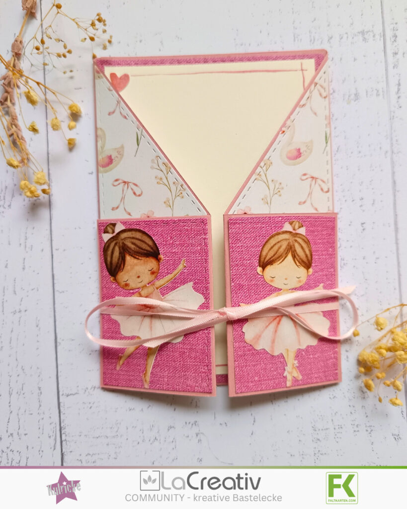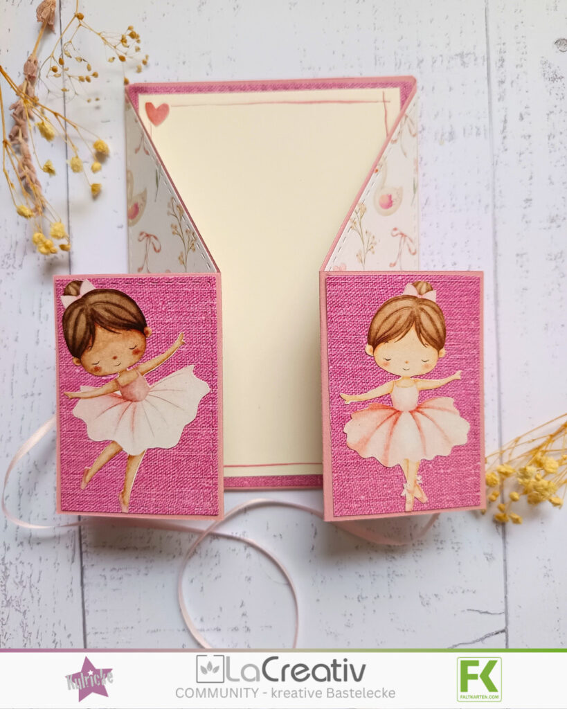 Ich habe schön dezente Muster für den Hintergrund verwendet, damit die Ballerinas ihren Hauptauftritt auf der Karte bekommen. Die Karte habe ich dieses Mal mit einem zarten rosafarbenen Band verschlossen, welches super zu dem gesamt Wert passt.