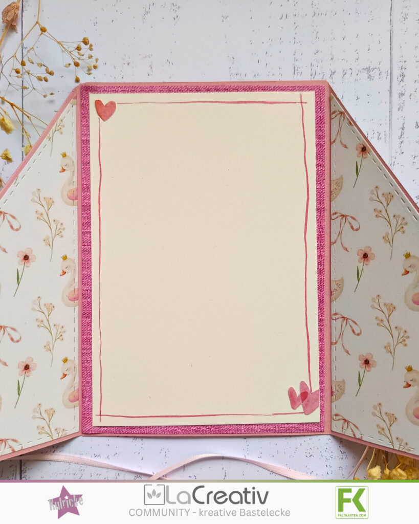 Der Inneren Bereich habe ich ganz schlicht mit weißem Cardstock gelassen. Die Herzchen an den Ecken sind ebenfalls kleine Details aus dem Designpapier Set. Um der Karte einen Rahmen zum geben, habe ich mit einem rosa Stift die Linien am Rand gezogen. Und fertig war die Karte. Ich bin wirklich verliebt in sie – sie schreit förmlich nach einer Geburtstagskarte für eine kleine Ballerina. Was sagt ihr dazu? In dem Sinne, traut euch kreativ zu sein.