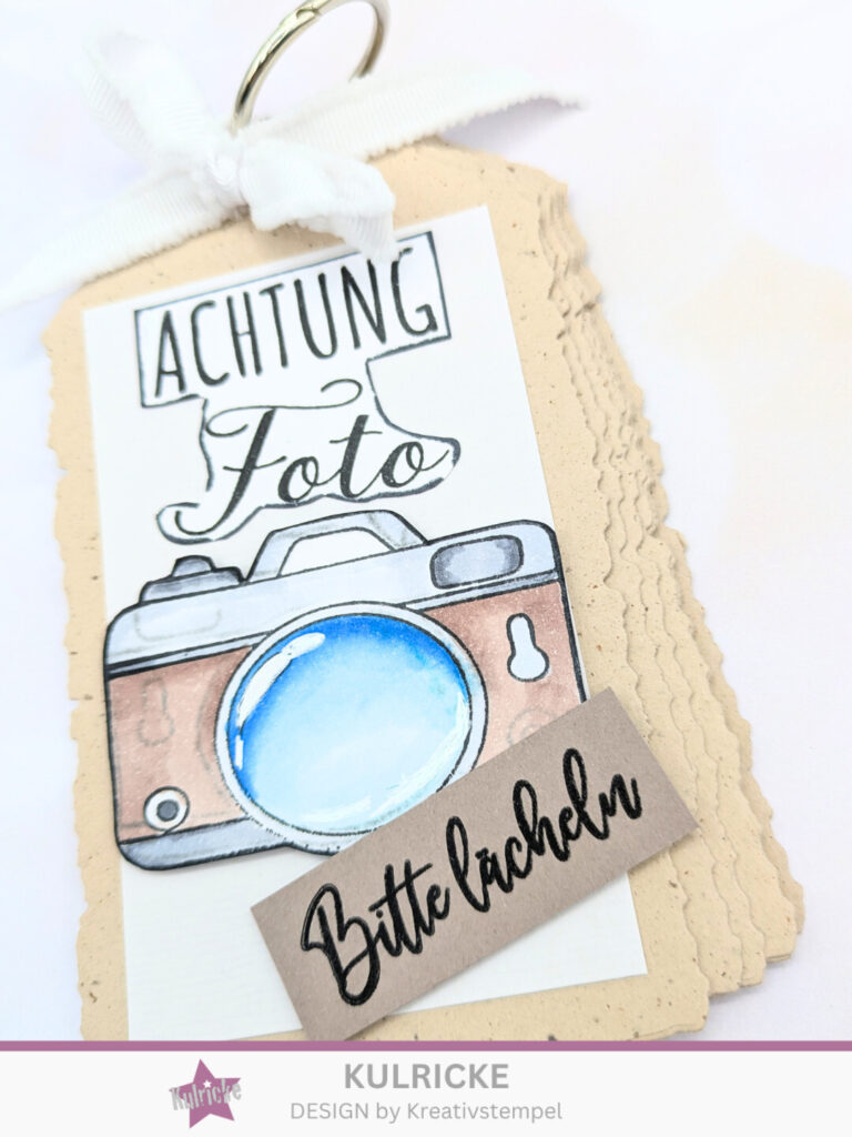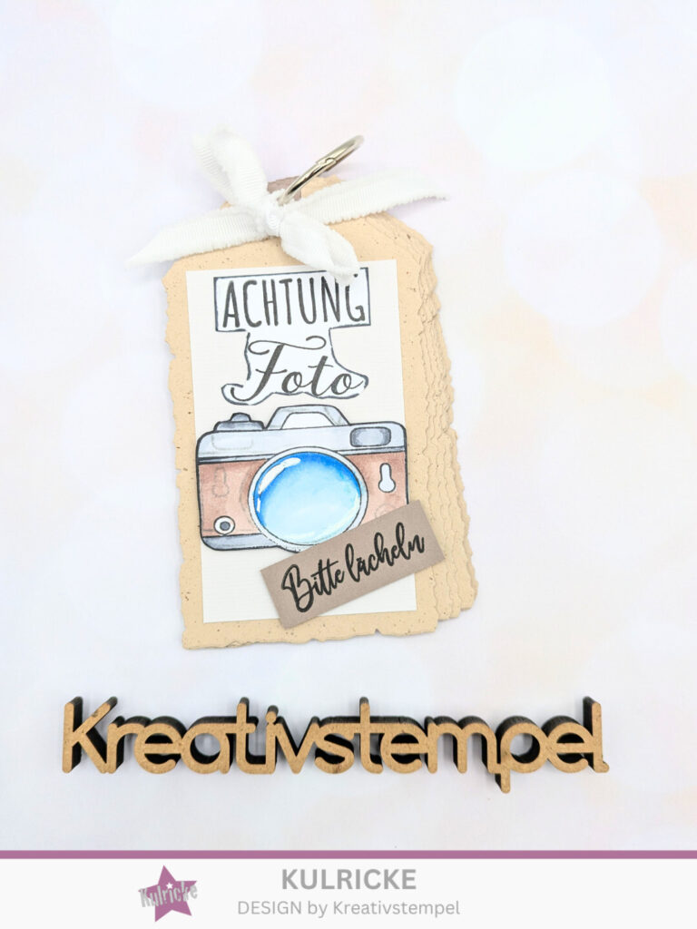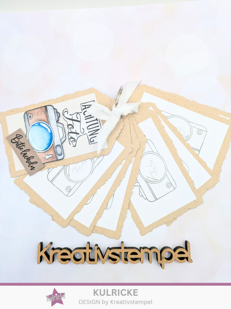 Als erstes stanzt ihr euch die Tags aus. Ich habe 8 Stück gemacht. Diese dann mit den Lochverstärkern versehen. Aus dem weißen Farbkarton habe ich 8 Stück in 10 x 6 cm ausgeschnitten und diese auf die Tags geklebt. Wenn ihr möchtet, könnt ihr so wie ich in einem leichten Grauton die Fotoapparate aufstempeln, als Symbol dafür, dass man hier Fotos aufkleben kann. Man kann aber auch nur mit Bleistift FOTO drauf schreiben.