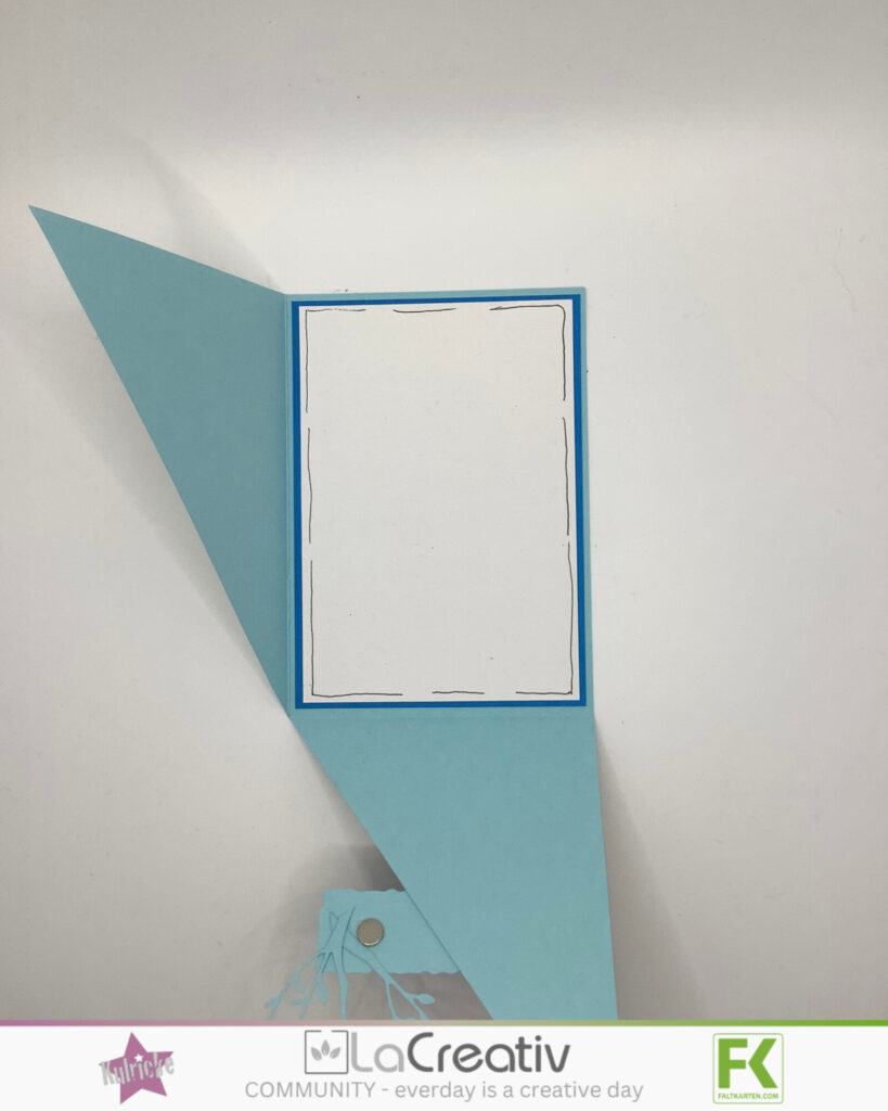 Benötigt habe ich einen Bogen Struktur Blue Peppermint den ich von der kurzen Seite bei 10,5 und von der langen Seite bei 14,85 cm gefalzt habe. Dann habe ich den Bogen diagonal durchgeschnitten und das eine Teil dann gefalzt.