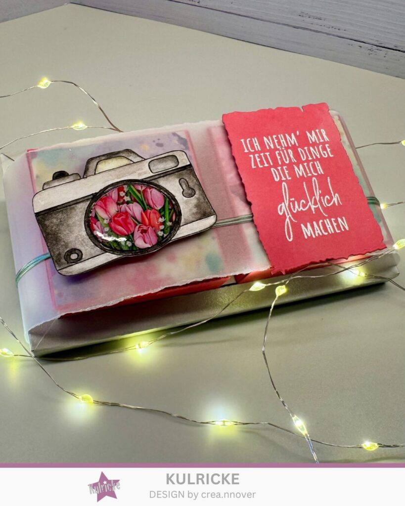 - Den Fotoapparat abstempeln und kolorieren. Die Linse ausschneiden und mit den Tulpen hinterkleben.