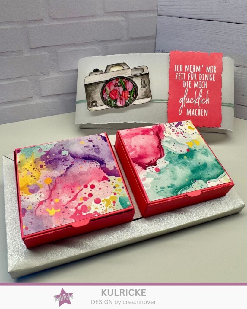 Heute möchte ich euch ein besonderes Verpackungsprojekt zeigen: einen Shadowrahmen mit Banderole, der gleich zwei kleine Geschenkboxen stilvoll in Szene setzt. Diese Kombination eignet sich wunderbar, um eine kleine Aufmerksamkeit kreativ zu verpacken. Durch die transparente Banderole und die dekorativen Elemente entsteht ein edler und gleichzeitig verspielter Look. ✨