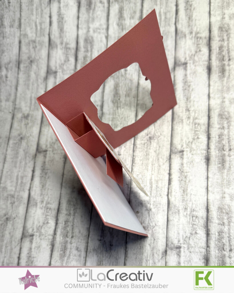 Der Aufleger für Innen hat auch die Maße 13,4×10,2 cm. Ich habe ihn aus weißer Pappe zugeschnitten. Diesen habe ich auch schon aufgeklebt.