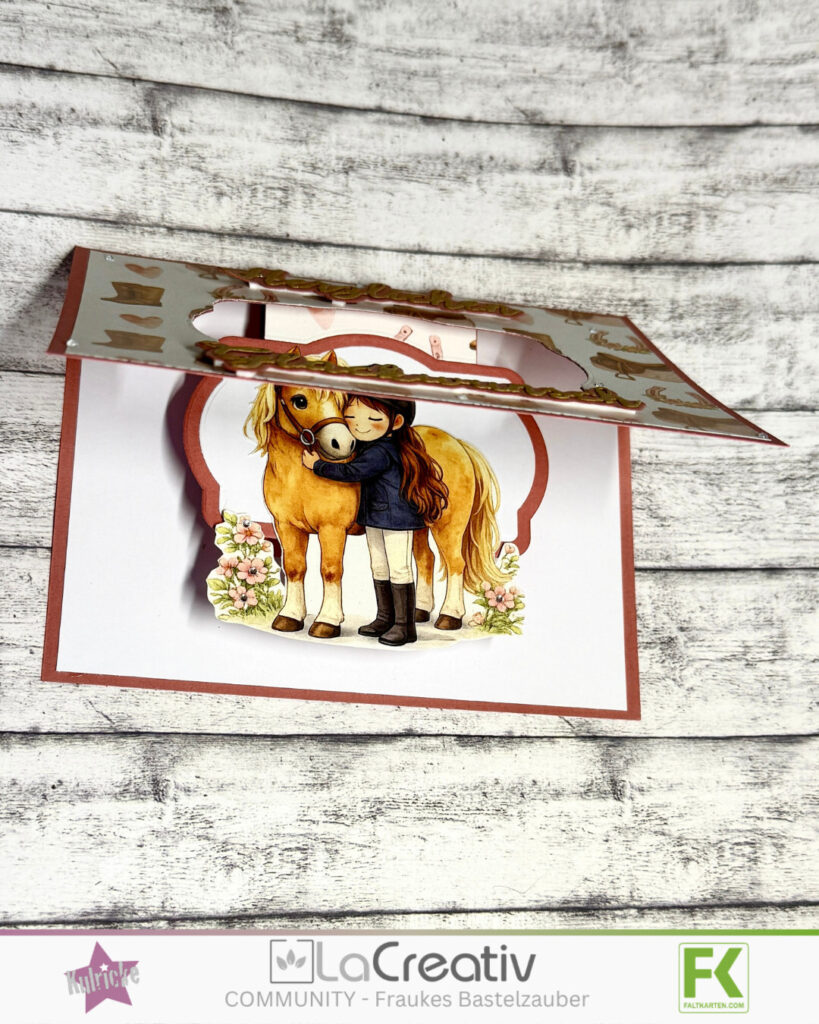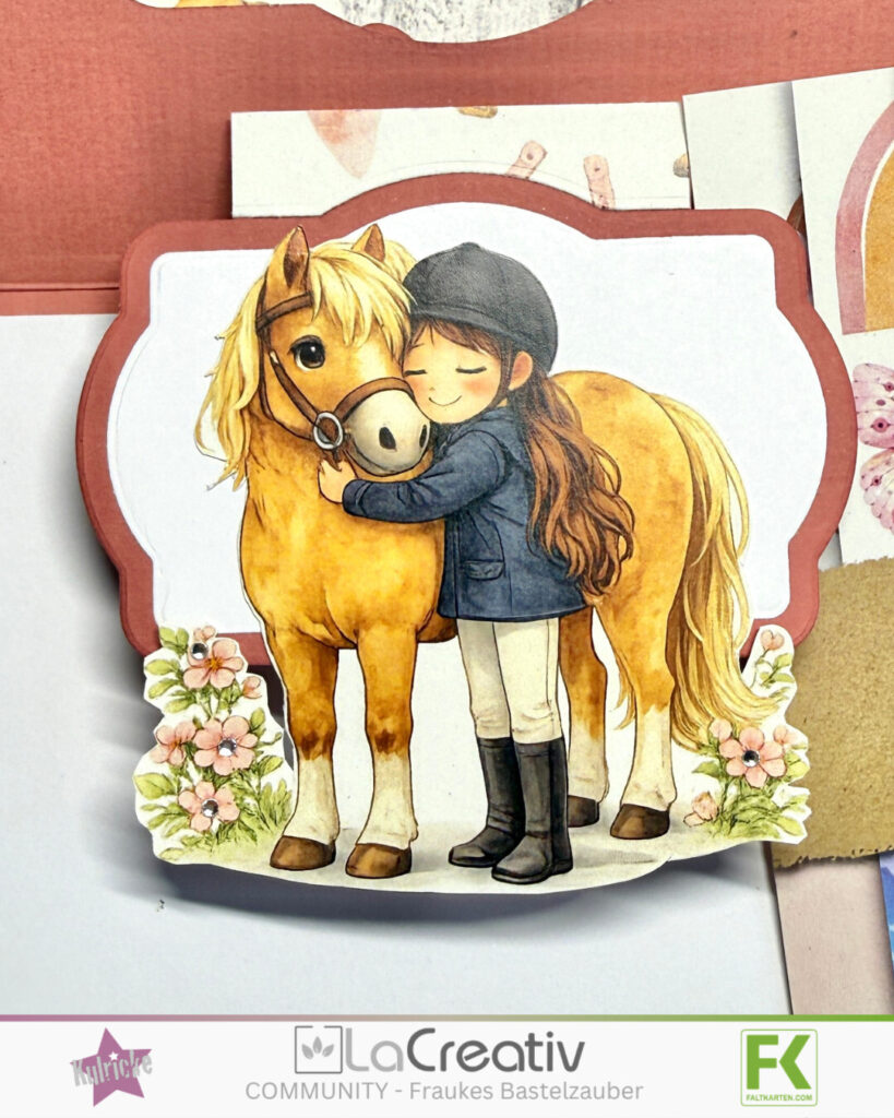 Jetzt habe ich erst das ausgeschnittene Pferd ( auch aus dem Designpapier „Pferde und Einhörner) auf das Schild aufgeklebt.