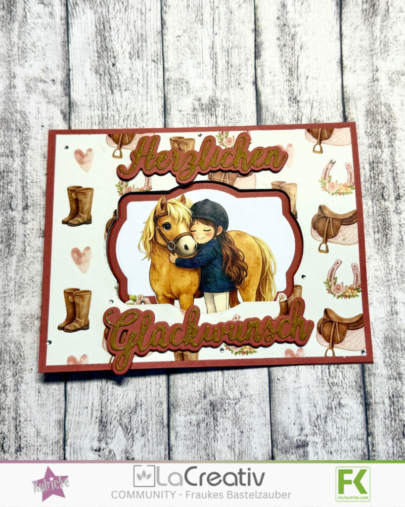 Die Grundkarte hat die Maße 10,8×14 cm (also ein stück Pappe in 21,6×14 cm zuschneiden und bei 10,8 cm an der langen Seite falzen). Den Aufleger habe ich aus einem Bogen des neuen Designpapier „Pferd und Einhörner“, mit den Maßen 13,4×10,2 cm, zugeschnitten. Der Aufleger kann auch direkt aufgeklebt werden, aber nur an den Rändern.