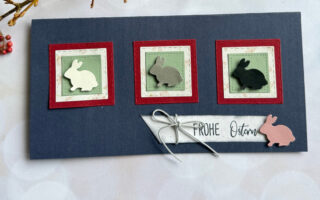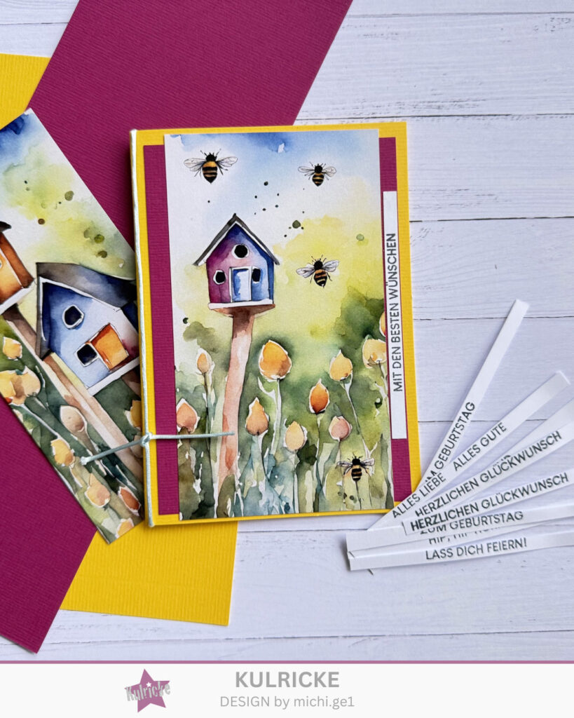 Aus Designpapier ein schmäleres, aber längeres Teil (als das Papierteil in brombeer) zuschneiden und darüber kleben.