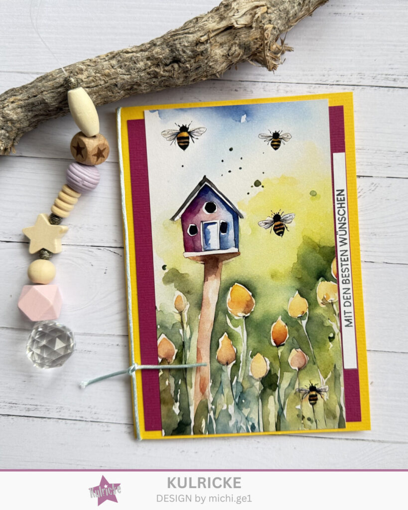 Aus dem honigfarbenen Cardstock eine Klappkarte und aus dem brombeerfarbenen eine Mattung und diese aufkleben.