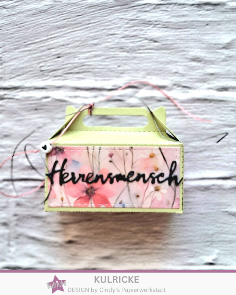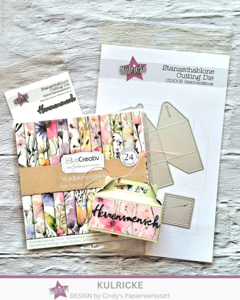 Mit der Kulricke Stanzschablone „Geschenkebox“ zaubert man ganz einfach eine tolle Box. Für die Aufleger habe ich eines meine absoluten Lieblingspapiere genutzt LaCreativ – Designpapier „Wildblumenglück“. Komplett wird die Box mit der wunderbaren Kulricke Stanzschablone „Herzensmensch“.