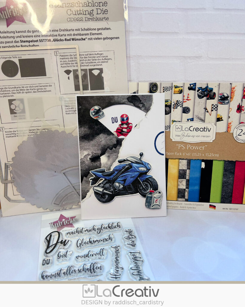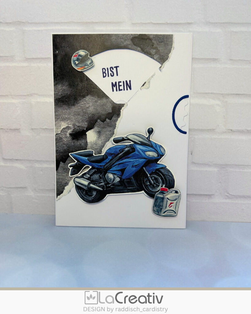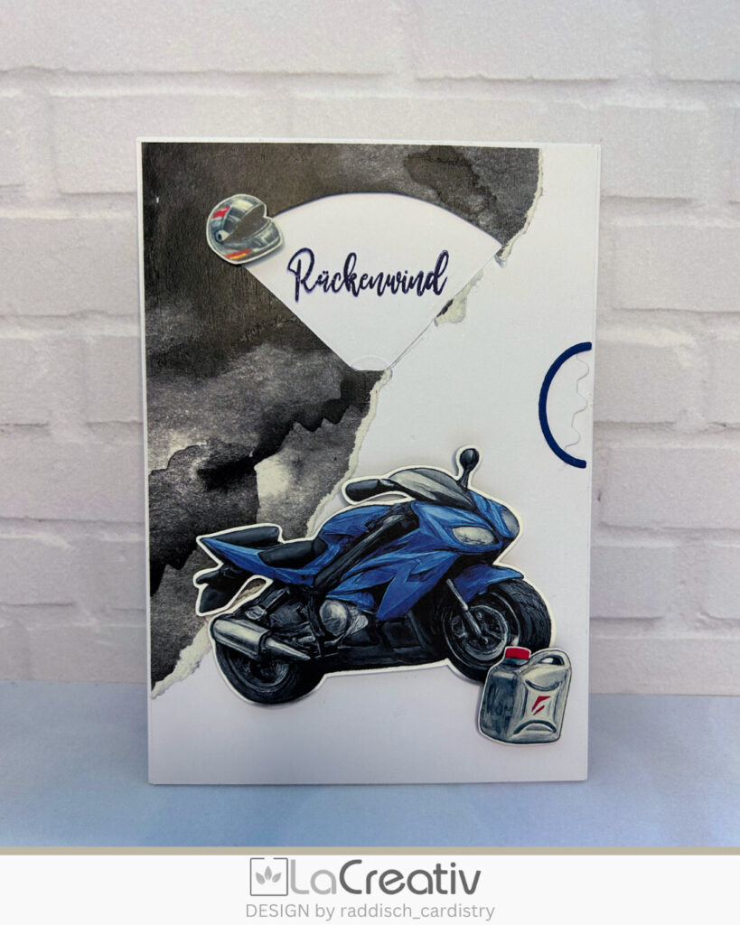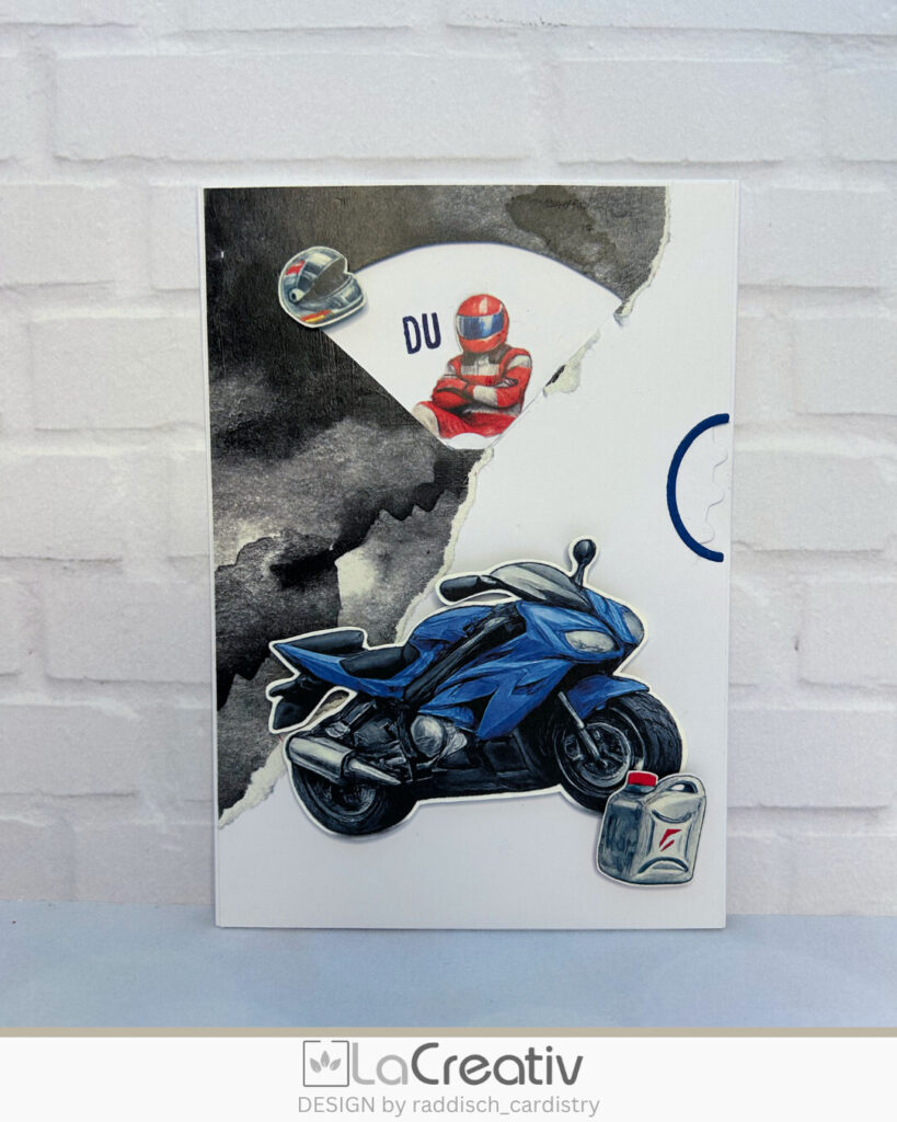 7. Als Deko habe ich noch das Motorrad, den kleinen Helm und den Benzinkanister ausgewählt. Die findet ihr alle im Designpapierpäckchen „PS Power“ und sind perfekt zum ausschneiden. Zusätzlich gibt es im Stanzenset „Drehkarte“ für alle Fenster auch passende Rahmen. Damit habe ich für die Aussparung zum Drehen am Rand der Karte den Rahmen in blau ausgestanzt.