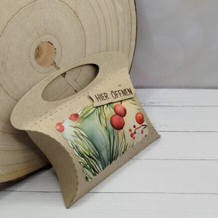 Zu Weihnachten hat man leider nicht immer viel Zeit für den Basteltisch. Darum bieten sich Verpackungsstanzen gut an um Kleinigkeiten oder Geld zu verschenken. Ich hab die Pillowbox ausgestanzt und mit dem schönen Papier Chismas Aquarell beklebt. Dann habe ich die Falzlinien eingebogen und die …