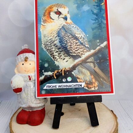 Heute habe ich eine Karte mit einer wunderschönen Schleiereule… Ihr braucht dazu: Ein weißer DinA4 Cardstock wird auf der kurzen Seite bei 10.5 cm gefalzt, auf der langen Seite schneiden bei 14,5 und 29 cm. Einen weißen und hochroten Aufleger in 14×10 cm. Das DSP …