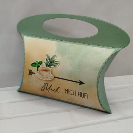 Eine schnelle Geschenkverpackung für Gutscheine, Süßigkeiten oder Tee. Ich habe die Pillowbox Stanze einmal mit der Stanzmaschine ausgestanz und mit dem Papier Teeliebe dekoriert. Dann noch auf dem Papier gestempelt und es aufgeklebt. Folgendes habe ich verwendet: