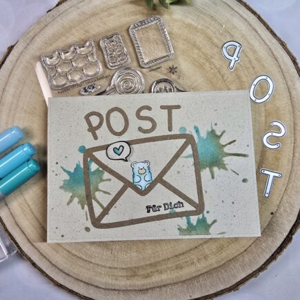 Diese wundervolle Briefumschlagstanze ist neu im Shop. Für den Hintergrund habe ich die Kleckse mit dem Stencil Grunge gewischt. Das Bärchen ist wieder aus dem Stempelset Lebkuchenhaus. Die Buchstaben sind vom Stanzenset ABC- Großbuchstaben. Das kleine Herzchen stammt aus dem Stempelset Koalaliebe. Schau hier gerne …