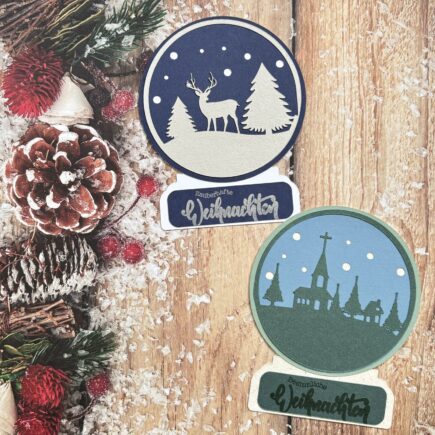 Hallo Ihr Lieben, heute habe ich verschiedene Ideen mit der Schneekugel von Kulricke für euch. Verwendet habe ich hierfür Cardstock in Nachtblau, weiß, Recycling Bermgas, Graublau, Eukalyptus und Metallic Grün. Bestempelt habe ich die Label mit einem Schriftzug aus dem Kulricke-Set „Weihnachtsbanner“. Eine weitere Idee …