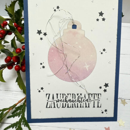 mit einem Hauch Silber und Sternen wünsche ich mit dieser Karte: Material: Aus meinem Bestand: Anleitung: Weißen Cardstock zuschneiden und den Rand mithilfe des Fingerschwämmchens und schwarzer Stempelfarbe betupfen. Die Kugel wird einmal in den weißen Aufleger und einmal aus dem Designpapier ausgestanzt.Die aus Designpapier …