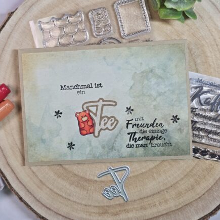 Schön, dass du wieder da bist. Letzte Woche habe ich aus der Kakao Stanze schon eine Karte gezeigt, heute ist die Tee-Stanze dran. Wie auch letzte Woche habe ich das Designpapier Kakaoliebe verwendet. Beim Spruch aus dem Set Kaffee ist Therapie habe ich das Wort …