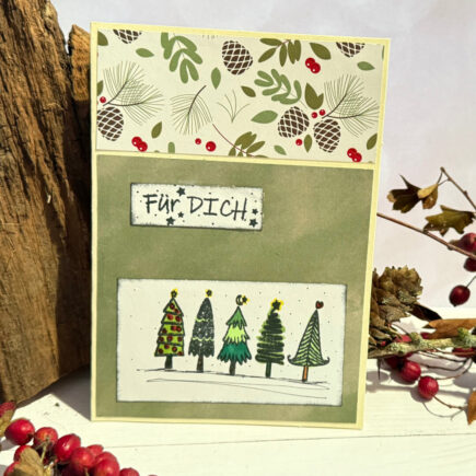 gehören in vielen Varianten zur Advents- und Weihnachtszeit dazu. Material: Aus meinem Bestand: Anleitung: Das Designpapier auswählen, zuschneiden und auf die Klappkarte kleben. Auf weißes Tonpapier die Bäume, Schrift und Sterne aufstempeln, ggf. colorieren.Die Ränder mit schwarzer Stempelfarbe und mithilfe eines Fingerschwämmchens betupfen. Die beiden …