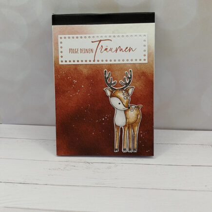 Den Papa von der Rehfamilie habe ich benutzt um einen Notizblock zu verschönern. Einfach den Block abgemessen und das Papier passend zugeschnitten. Vorher habe ich natürlich noch den Rehpapa mit Aquarellfarbe koloiert, ausgeschitten und auf das Papier geklebt. Und so hat man schnell ein besonderes …