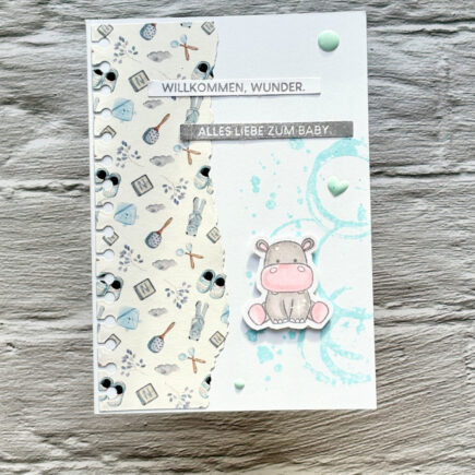 Eine niedliche Karte um ein neues Wunder zu begrüßen! Die Materialien LaCreativ – Designpapier „Himmelblaues Babyglück“ Paper Pack 6×6″ – 24 Bogen Kulricke Stempel „Kaffeespuren“ Clear Stamp Kulricke Stempel „Hippotastisch“ Clear Stamp Kulricke Stempelset „Zum Baby Label“ Clear Stamp Kulricke Stanzschablone „Text Label“ Craft Die …