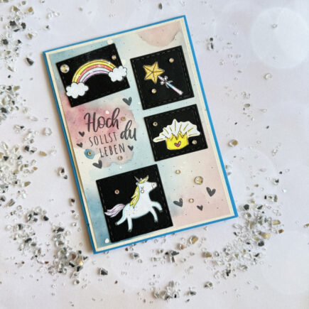 Heute hab ich mal ein sehr buntes und fröhliches Lesezeichen zu zeigen. Mit dem tollen neuen Einhornset. Verwendet habe ich dafür: Stempel: „Kleine Einhornwelt“ und „Glückslichter„ Stanzen: „Lesezeichen„ Designpapier: „Pastellzauber„ Cardstock: „lila„ Zuerst habe ich das Lesezeichen aus Cardstock ausgestanzt. Dann habe ich mir aus …