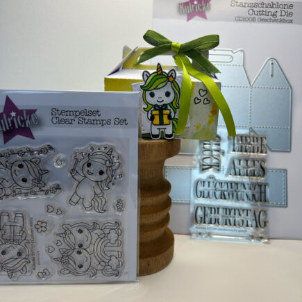 Hallo Ihr Lieben, heute habe ich eine Geschenkbox zum Geburtstag für euch. Ideal zum Beispiel für den Kindergeburtstag. Für die Grundschachtel habe ich Cardstock in Tiefseeblau gewählt. Diese habe ich mit der Stanzschablone Geschenkbox von Kulricke (ab April im Shop erhältlich) ausgestanzt. und mit einem …