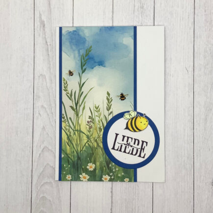 Hallo, heute am ersten Tag des Monats möchte ich den Frühling ein bisschen locken. Dazu habe ich eine einfache Karte gemacht, auf die ich zunächst einen Streifen blauen CS geklebt habe. Dann habe ich einen Streifen DSP aus dem Paket Aquarell Wiesen und Weiden 5mm …