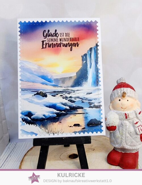Auch heute habe ich wieder ein Designpapier aus dem wunderschönen Set „Arctic Winter“ auf einer Karte verwendet. Sie ist nicht besonders aufwendig, denn ich wollte das Papier wirken lassen. Zunächst nahm ich eine weisse Kartenbasis und schnitt einen Aufleger aus hellblauem Cardstock dazu. Diesen klebte …