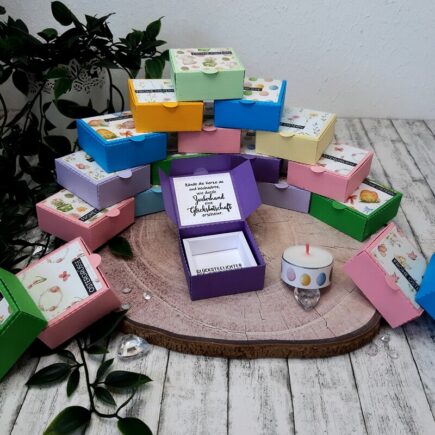 Für Ostern sind hier 20 Glücksteelichter mit Verpackung entstanden. Verwendet habe ich dafür: Stempel: „Osterlicht„, „Glückslichter“ und „Adventslichter„ Stanzen: „Pizzabox klein„, „Einsatz Teelicht“ und „Aufleger Pizza klein gestrichelt„ Designpapier: „Hoppelige Frühlingsgrüße“ und „Kleine Osterwelt„ Cardstock: „diverse Farben„ Zuerst habe ich aus Cardstock die kleine Pizzabox …