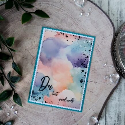 …mit wichtiger Botschaft! Heute habe ich eine sehr einfache Karte für Euch dabei, dafür mit einer wichtigen Botschaft. Verwendet habe ich dafür: Cardstock: „struktur türkis“ und „puderweiß„ Designpapier: „Pastellblumen„ Stanzen: „Wellenrand A6„ Stempel: „DU bist wundervoll“ und „Kleckse„ Sonstiges: Strasssteinchen Aus dem Cardstock in türkis …