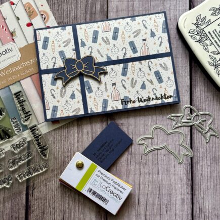 Hallo Ihr Lieben, weiter gehts in der Weihnachtskarten-Produktion. Für die Grundkarte habe ich Cardstock in Nachtblau gewählt. Aus dem Designpapier „Gemütliche Weihnachtszeit“ habe ich einen Bogen als Aufleger zurecht geschnitten. Aus Cardstock in Nachtblau habe ich dünne Streifen geschnitten und die Kontur der Schleife ausgestanzt. …