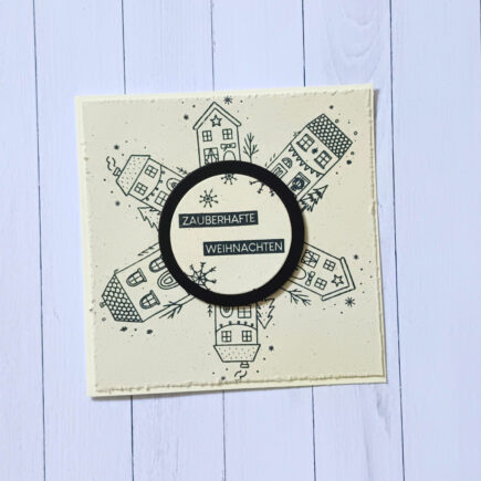Designteambeitrag/enthält Werbung Ja liebe Bastelfreunde heute gibt es wieder eine Weihnachtskarte. Das neue Stempelset mit den Häuschen hatte es mir einfach angetan. Aus dem Designerpapier „Spaziergang im Winterwald“ suchte ich mir einen verschneiten Hintergrund mit Tannen aus. Diesen schnitt ich zurecht für eine weiße Karte …