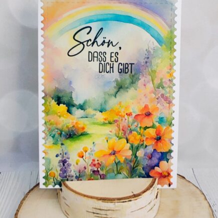 Heute zeige ich Dir einer meiner Lieblingskarten. Ich habe mit einer hellen Stempelfarbe die Motive gestempelt und dann mit Aquarellfarben koloriert. Am Schluss dürfen Sprenkel nicht fehlen. Folgendes habe ich verwendet: