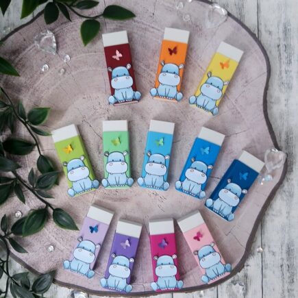 Für die Stempeltreff-Messe habe ich diese Radiergummis als Tauschis vorbereitet. Dafür habe ich einfach Reststücke Cardstock so zugeschnitten, dass sie als Bandarole um die Radiergummis passen. Darauf die gestempelten, colorierten und ausgeschnittenen kleinen Nilpferde kleben. Mit kleinen Schmetterlingen verzieren und Fertig sind schöne, kleine, Tauschis. …