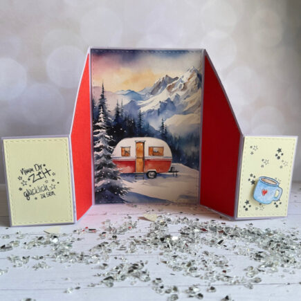 An einem romantischen, verschneiten Plätzchen in den Bergen campen.Ein schöner Gedanke, oder? Material: Aus meinem Bestand: Anleitung: Die Karte 2x aus lila Tonpapier ausstanzen, die beiden Mittelteile zusammenkleben.Aus Designpapier den großen Aufleger,rotem Tonpapier die beiden mittleren Aufleger und aus hellgelben tonpapier die kleinen Aufleger ausstanzen.Bestempeln …