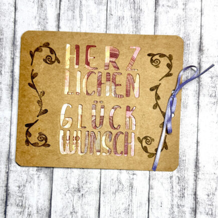 Hallo Ihr Lieben, Glückwunschkarten kann man nie genug haben. Diese ist perfekt um Geld zu verschenken oder auch einfach so. Den Kartenrohling habe ich aus dem Cardstock- Bastelpapier „Recycling Natur“ zugeschnitten und die Ecken abgerundet. Auf der rechten Seite habe ich noch zwei Löcher für …