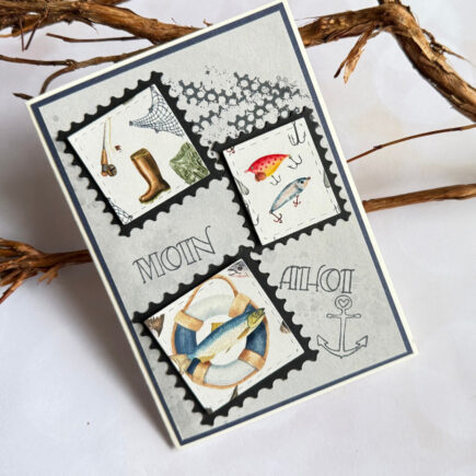 Hallo zusammen Es gibt noch einmal eine Karte für Angler. Ihr braucht dazu Fur die Karte mit der Auflegerstanze ein DSP Aufleger ausstanzen. Dieser Aufleger wird mit einem Spruch aus dem Stempelset bestempelt und anschließend auf eine Grundkarte, 21×14, 5 cm gefalzt bei 10,5cm, geklebt. …