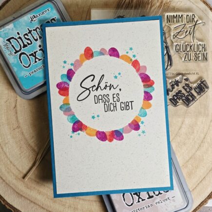 Heute habe ich eine Karte für dich, wo Farbe ins Spiel kommt. Dazu brauchst du nur verschiedene Stempelkissen und einen schönen Schriftzug. Ich habe mir einen Kreis ausgeschnitten und ihn auf den Aufleger der Karte gelegt. Mit den Distress Kissen und einem kleinen Ei-Stempel habe …