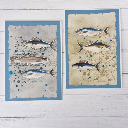 Hallo, heute habe ich 2 Karten mit dem neuen Papier „Anglerglück“ für euch Als erstes habe ich mir mein Motivpapier ausgesucht und anschließend die Fische mit der Schere ausgeschnitten. Als ich das erledigt hatte, habe ich mir die Hintergrund Papiere vorgenommen und erstmal mit Klecksen …