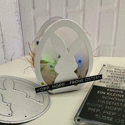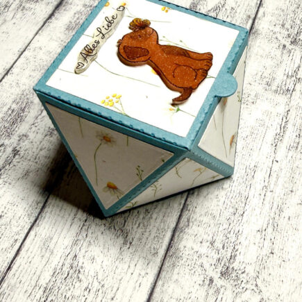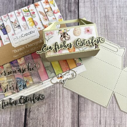 Hallo Ihr Lieben, heute habe ich eine kleine Oster-Geschenkbox für euch. Für die Grundschachtel habe ich Cardstock in Kiwi gewählt. Diese habe ich mit der Stanzschablone Geschenkbox von Kulricke (ab April im Shop erhältlich) ausgestanzt. Diese habe ich dann mit einem Aufleger aus dem Designpapier …