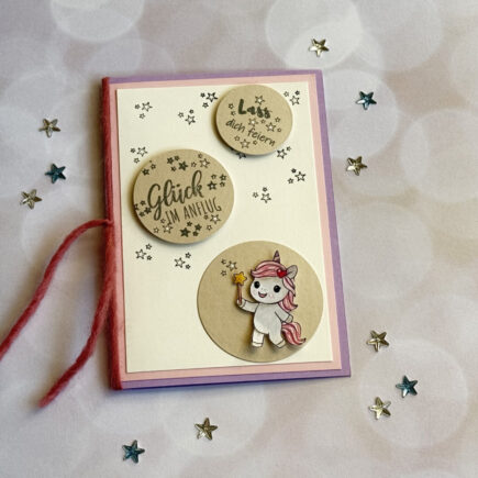 mit Sternchenzauber findet ihr heute auf meiner Karte: Material: Aus meinem Bestand: Anleitung: Aus Cardstock Lavendel eine Klappkarte herstellen und 2 Aufleger (Babypink und Elfenbein), siehe Foto. Aus Perlmutt crema je einen Kreis in5,6 cm, 4,6 cm, 3,6 cm ausstanzen. Ein Einhorn auf weißes Papier …