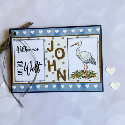 Eine Glückwunschkarte zum Baby habe ich gewerkelt und mitgebracht: Material: Aus meinem Bestand: Anleitung: Aus nachtblauem Cardstock eine Klappkarte herstellen. Designpapier mit Herzen zuschneiden und auf die Klappkarte kleben. DP mit braunen Punkten auf Cardstock walnuss kleben, mit kleinem Rand zuschneiden, aufkleben und auf Karte …